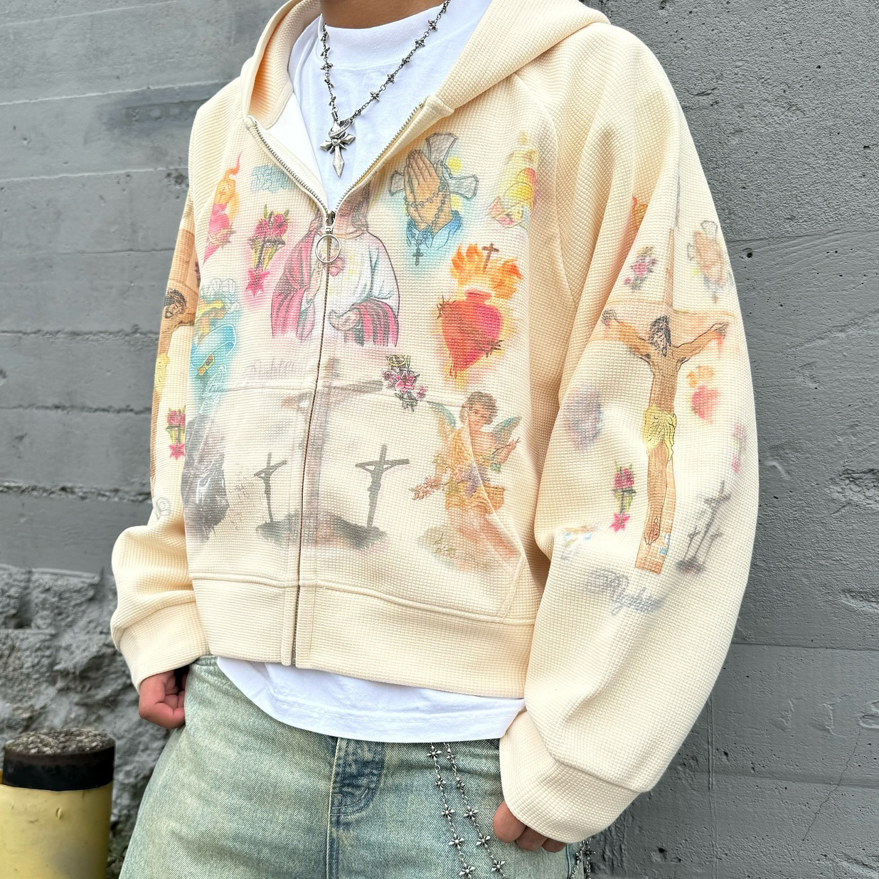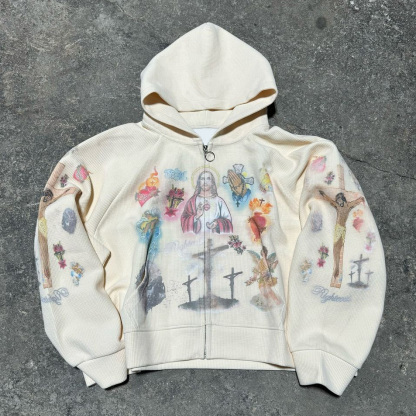 Jesus Print Patchwork Long Sleeve Zipper Hoodies